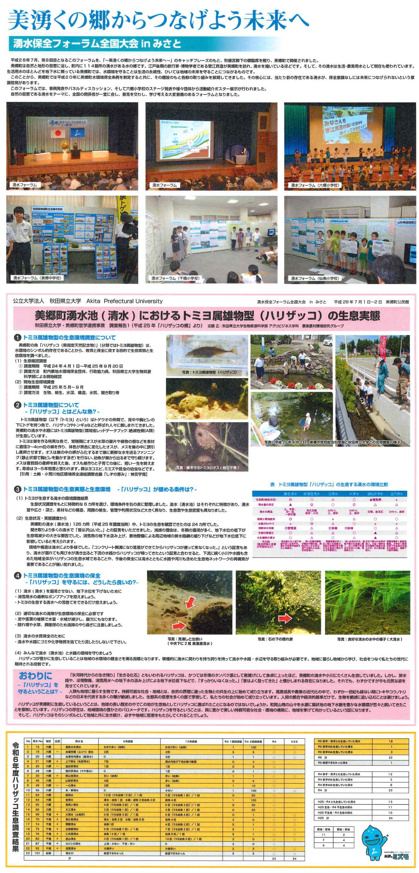 令和7年12月2日に岐阜県大垣市で開催された「水都大垣 水環境フォーラム2025」にポスターセッションとして美郷町が参加しました。町では、町遊水地(清水)におけるトミヨ属雄物型(ハリザッコ)の生息調査結果や、町内小学校、美郷中学校、北小屋ボランティア、天神堂清水川保全会の活動を紹介し、多くの来場者の関心を集めていました。
